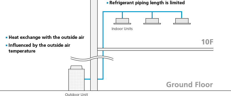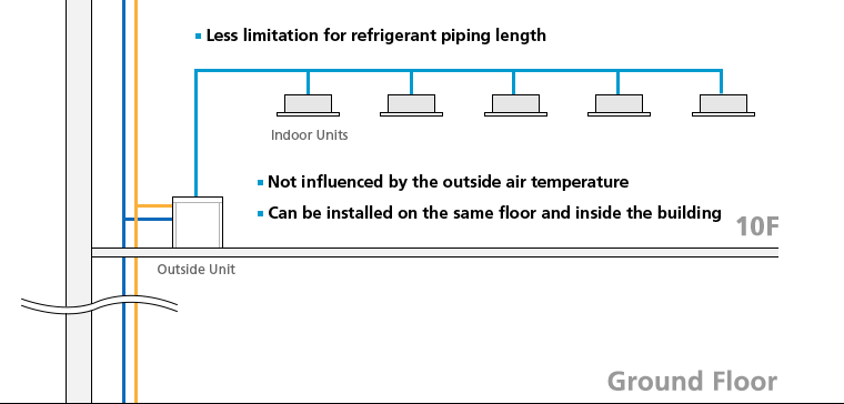 Depending on the location, there were cases when installation was not possible for air-cooled VRV because of refrigerant piping length. However, the appearance of water-cooled VRV allowed units to be flexibly arranged without limitations of refrigerant piping length. Individual air conditioning also became possible in large-scale buildings such as high-rise buildings. Because water-cooled type air conditioners do not require heat exchange with air, they can be installed in the closed environments of underground shopping areas and in cold climates where outdoor temperature is low. With the arrival of water-cooled VRV, the market of VRV has greatly expanded.
